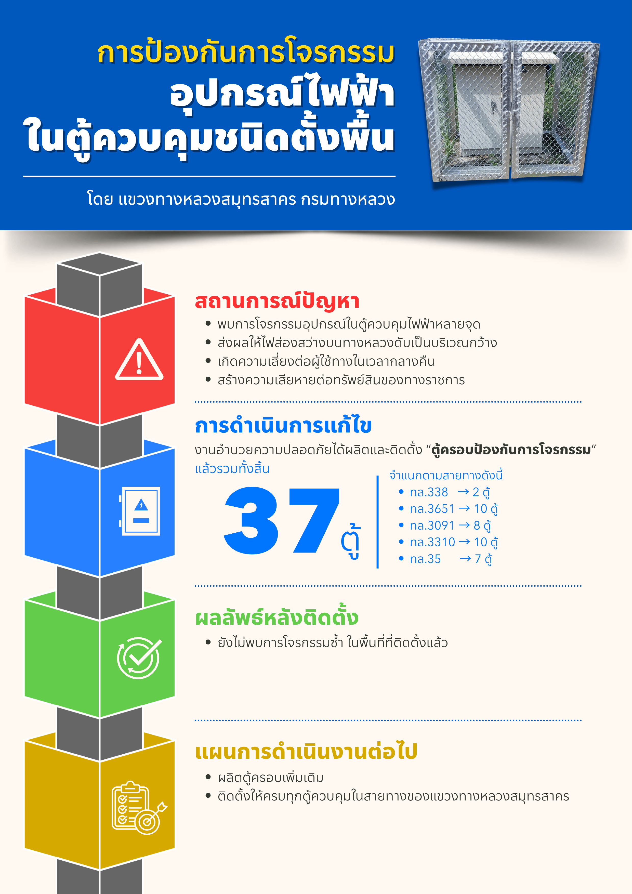 แขวงทางหลวงสมุทรสาครได้ดำเนินการป้องกันการโจรกรรมอุปกรณ์ไฟฟ้าในตู้ควบคุมชนิดตั้งพื้น หลังจากพบเหตุโจรกรรมหลายจุดจนทำให้ไฟส่องสว่างบนทางหลวงไม่สามารถใช้งานได้และเกิดความเสี่ยงต่อผู้ใช้ทาง งานอำนวยความปลอดภัยจึงได้ผลิตและติดตั้งตู้ครอบป้องกันการโจรกรรมรวม 37 ตู้ในสายทางต่าง ๆ ผลการดำเนินงานพบว่ายังไม่เกิดเหตุโจรกรรมซ้ำ และกำลังขยายการติดตั้งเพิ่มเติมเพื่อครอบคลุมทุกตู้ควบคุมในพื้นที่รับผิดชอบ